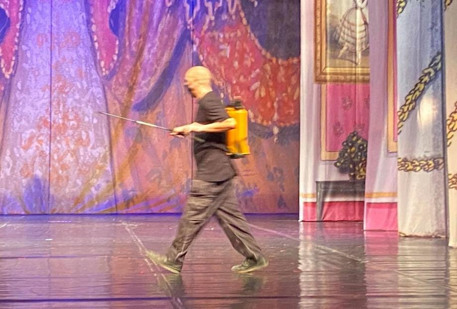 По време на репетициите в Държавната опера /както се вижда от снимките/ се спазват всички изисквания за дезинфекция, за да се запази здравето на павците, музикантите и балетистите.